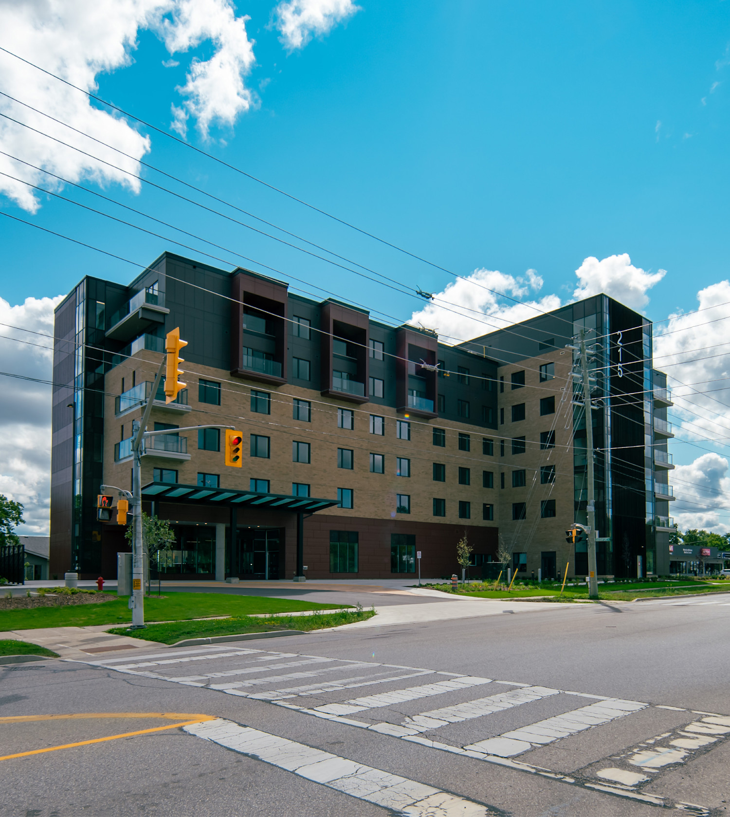This modern new Retirement Residence and Senior’s apartment building offers 216 units and 272 parking spaces. The retirement Residence offers a mix of independent and assisted living suites. The building was carefully designed to take advantage of the complex site topography. Shared indoor and outdoor amenity spaces have been provided for residents. This includes numerous lounges, a resident dining room, a private family dining room, a fitness area with a pickle ball court, and a large games room.